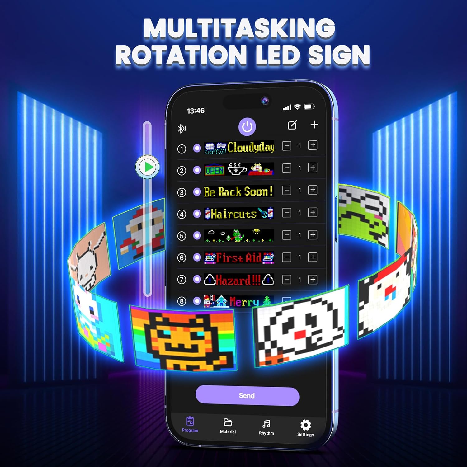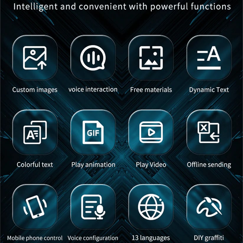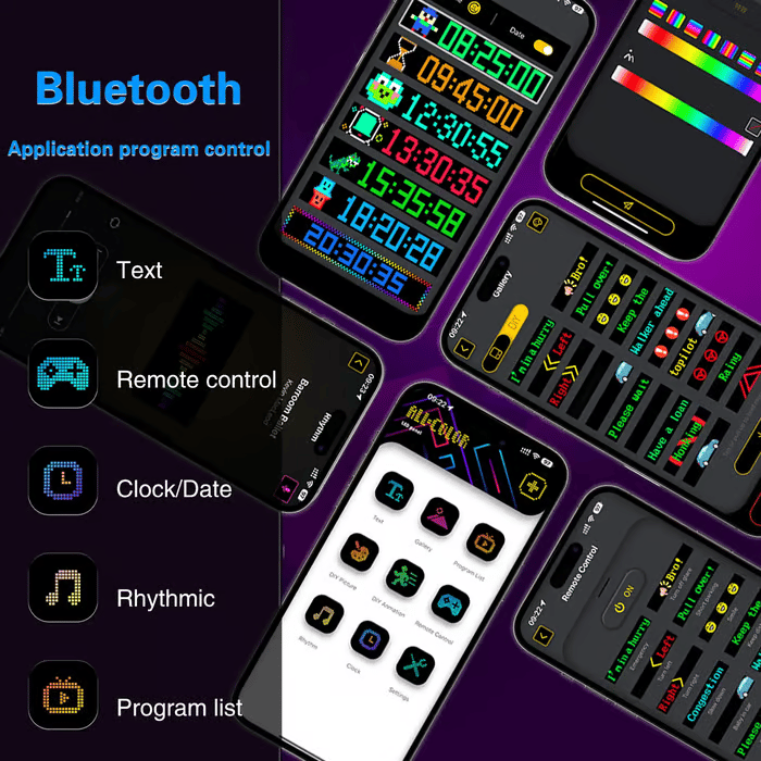 The programmable LED Sign is controlled by a Bluetooth connected app.The app has multiple editing functions, such as custom text, graffiti, patterns, animations, etc.