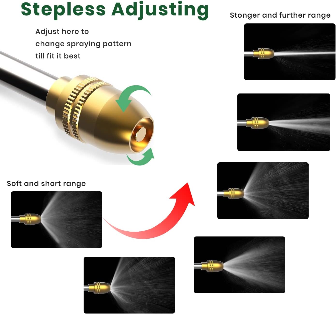 - STEPLESS ADJUSTING SPRAYING-Adjusting Spraying mode by rotating the head of nozzle to fit various demands for you,including cleaning your car, walkway,deck, home,yard,lawn,pets,etc.Water flow changed from soft and larger range to further and small range by adjusting spraying head.