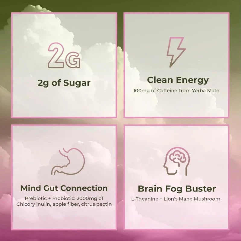 Experience the perfect fusion of yerba mate, matcha tea, prebiotics, probiotics, and nootropics in one delicious, easy-to-mix drink. This unique blend fuels your body and mind with clean energy, enhanced focus, and digestive support.