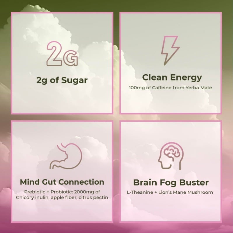 Natural ingredients including yerba mate, matcha, lion’s mane mushroom, bacopa, chicory inulin, and probiotics.